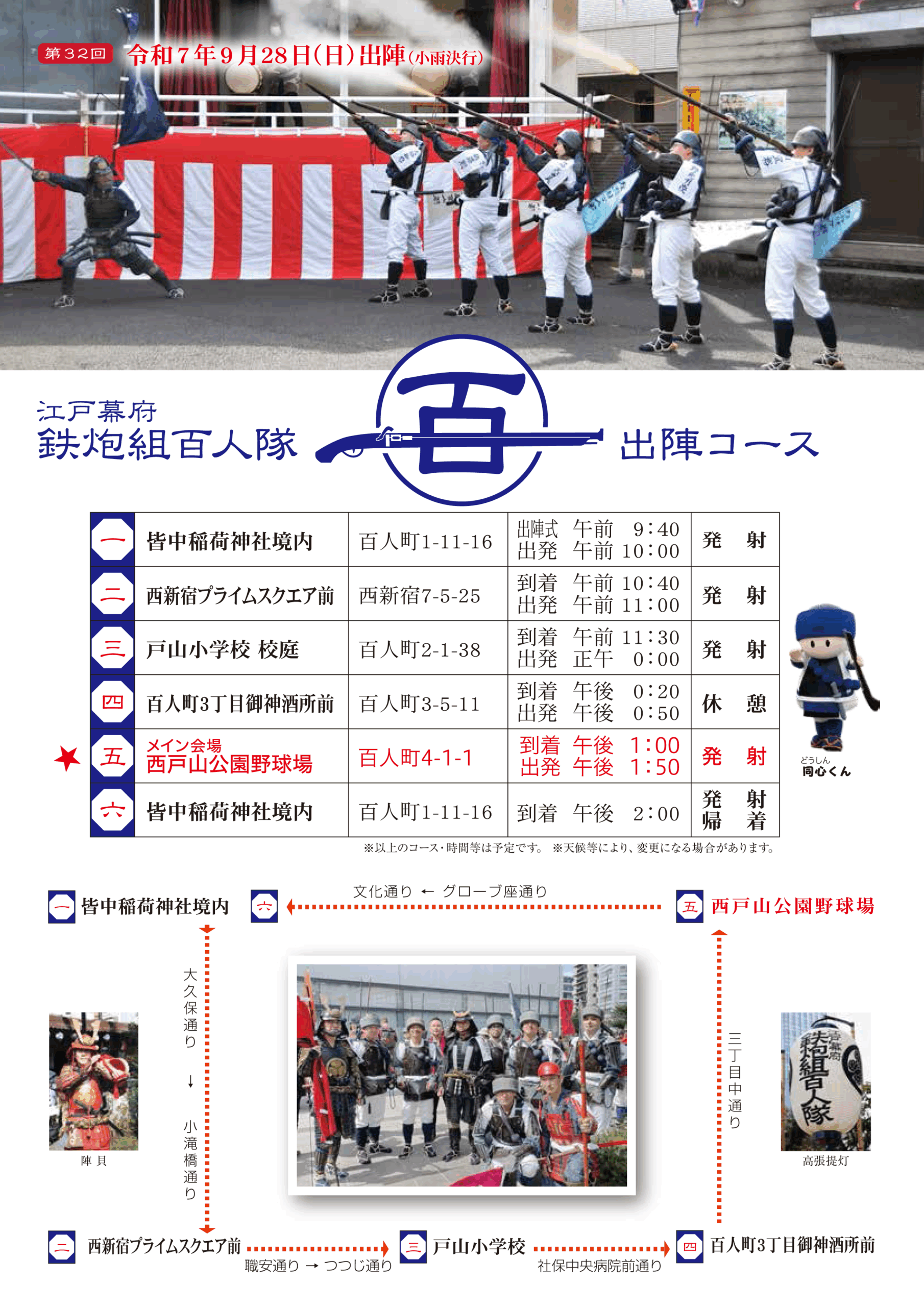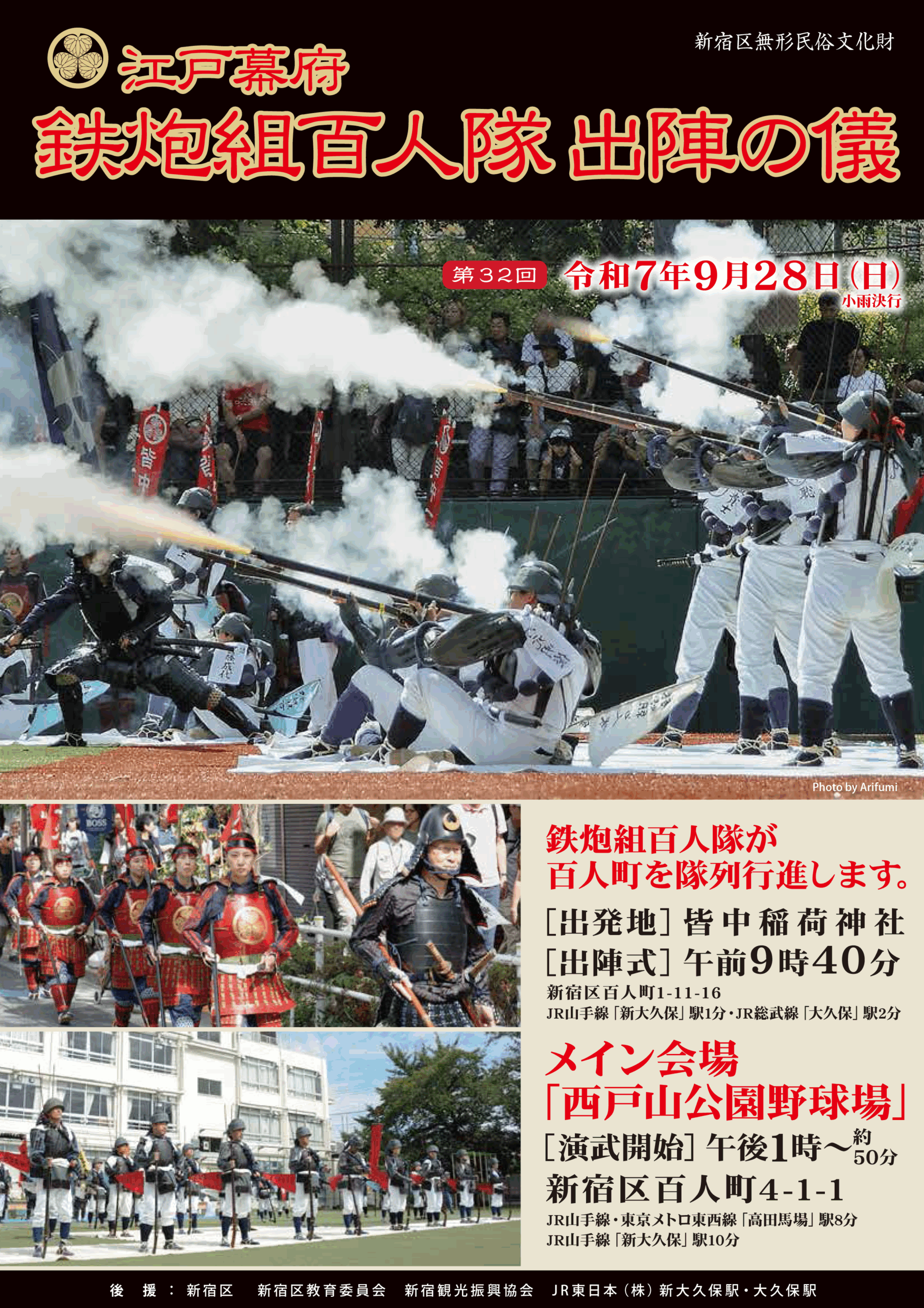 令和7年(2025)9月28日(日)に東京都新宿区で「江戸幕府鉄炮組百人隊」が隊列行進します。順路は皆中稲荷神社(発射)を出発して西新宿プライムスクエア前(発射)から戸山小学校校庭(発射)、百人町3丁目御神酒所前(休憩)を経てメイン会場の西戸山公園野球場での発射で有終の美を飾り、皆中稲荷神社(発射)に最後に戻ってきます。この間は「江戸幕府鉄炮組百人隊」の同心が揃いの装束で隊列行進をします。このイベントは2年に1回の開催です。